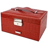 Red Crocodile Manmade Leather Top Opening 1-Drawer Jewelry Box Travel Case Necklace Earrings Bracelet Ring Storage Organizer with Lock Covered in manmade leather with stylish crocodile alligator skin design., Features a lift-up lid that reveals a mirror, 1 elastic pouch for small or loose items, 2 lift-out dividers with specially-designed holes for earrings, 2 rows of ring and earring holders, and 2 long compartments for earrings and bracelets., A pull-out drawer is divided into 3 separate compartments., Features a silver-tone metal lock with a matching key., Overall Approx. Dimensions: 4" H X 8" W X 6" D; Drawer and Top Compartment both: 1.5" H X 8" W X 6" D, This beautiful and sophisticated jewelry box is just the thing for keeping your jewelry organized and protected the stylish way. The exterior is made of manmade leather styled in a classic alligator pattern design, while the interior of this jewelry case is covered in soft material to cradle your jewelry and protect it from wear and tear. Open the lid to find different compartments for your different pieces: 1 elastic pouch for small or loose items; 2 lift-out dividers with specially designed holes for earrings; 2 rows of ring and earring holders; and 2 long compartments for necklaces or bracelets. On the bottom of the jewelry box, a drawer with 3 compartments give you even more storage options to accommodate watch or larger jewelry accessories. When your travels mean you have to get ready on the go, a mirror in the lid will help you make sure your look your best. And should you desire some extra security, simply lock your jewelry travel case with the provided key and lock se t. This stylish Jewelery Organizer Case is great for being organized as well as traveling comes with handle on top. Great gift idea for birthday, valentine's day, mother's day, thanksgiving, christmas and any special occassions.* Jewelry not included.Due to monitor variations colors may appear slightly different.