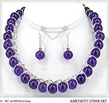Amethyst Necklace with 10 mm beads stylistically wrapped with silver tone copper wire. This piece is unique with beautiful flowing lines. The necklace is made of 8 & 10 mm glossy Amethyst 10 mm beads, finishing with coil wire, a lobster claw clasp and a three inch extension chain. The matching earrings have two Amethyst 10 mm beads and silver style oval ring at the top. The finished length of the necklace is 16 inches or 18 inches extended. Silver tone Necklace Amethyst Beads, Necklace features alternating translucent, glossy amethyst orbs and burnished silver droplets. Each amethyst bead on handmade jewelry flashes with rich violets and Purple.